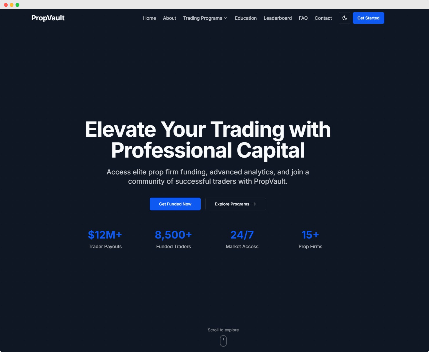 A modern, responsive landing page designed for a prop trading company to drive conversions from aspiring traders looking for professional capital through structured programs.